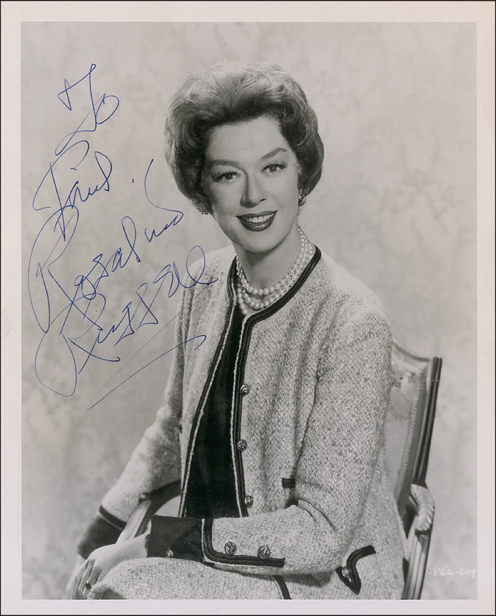 Lovely vintage glossy 8 x 10 photo of Russell in pearls and a suit dress, signed and inscribed in fountain pen, “To Paul, Rosalind Russell.” Scattered surface creasing and promo info affixed to the reverse, otherwise fine condition. Pre-certified PSA/DNA and RR Auction COA.