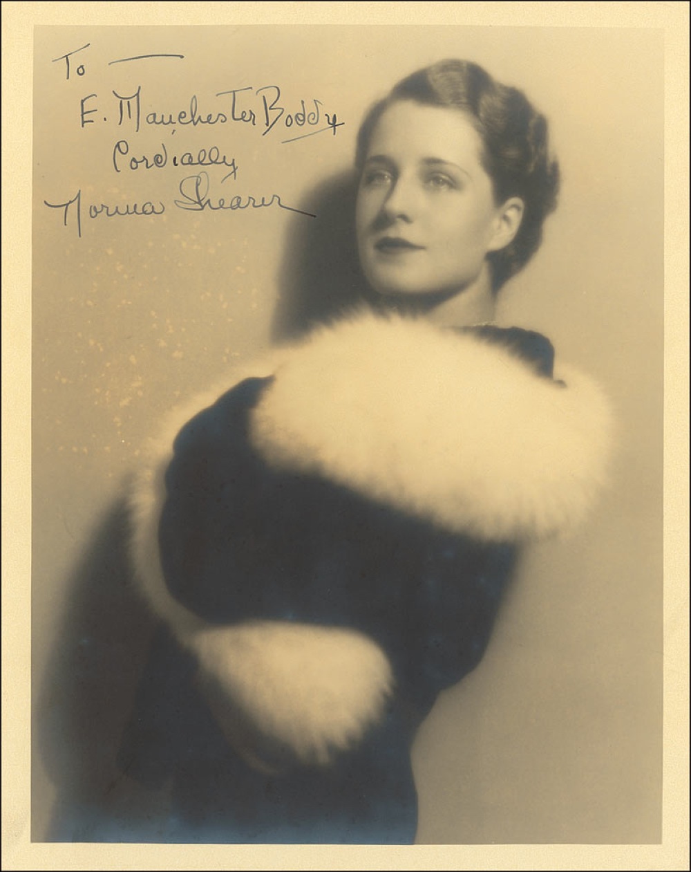 Vintage matte-finish 8 x 10 photo of Shearer wrapped in a fur-lined coat, signed and inscribed in fountain pen “To—E. Manchester Boddy, Cordially, Norma Shearer.” Scattered silvering along bottom edge and to darker areas, and light discoloration to background under signature, otherwise fine condition. Pre-certified PSA/DNA and RR Auction COA.