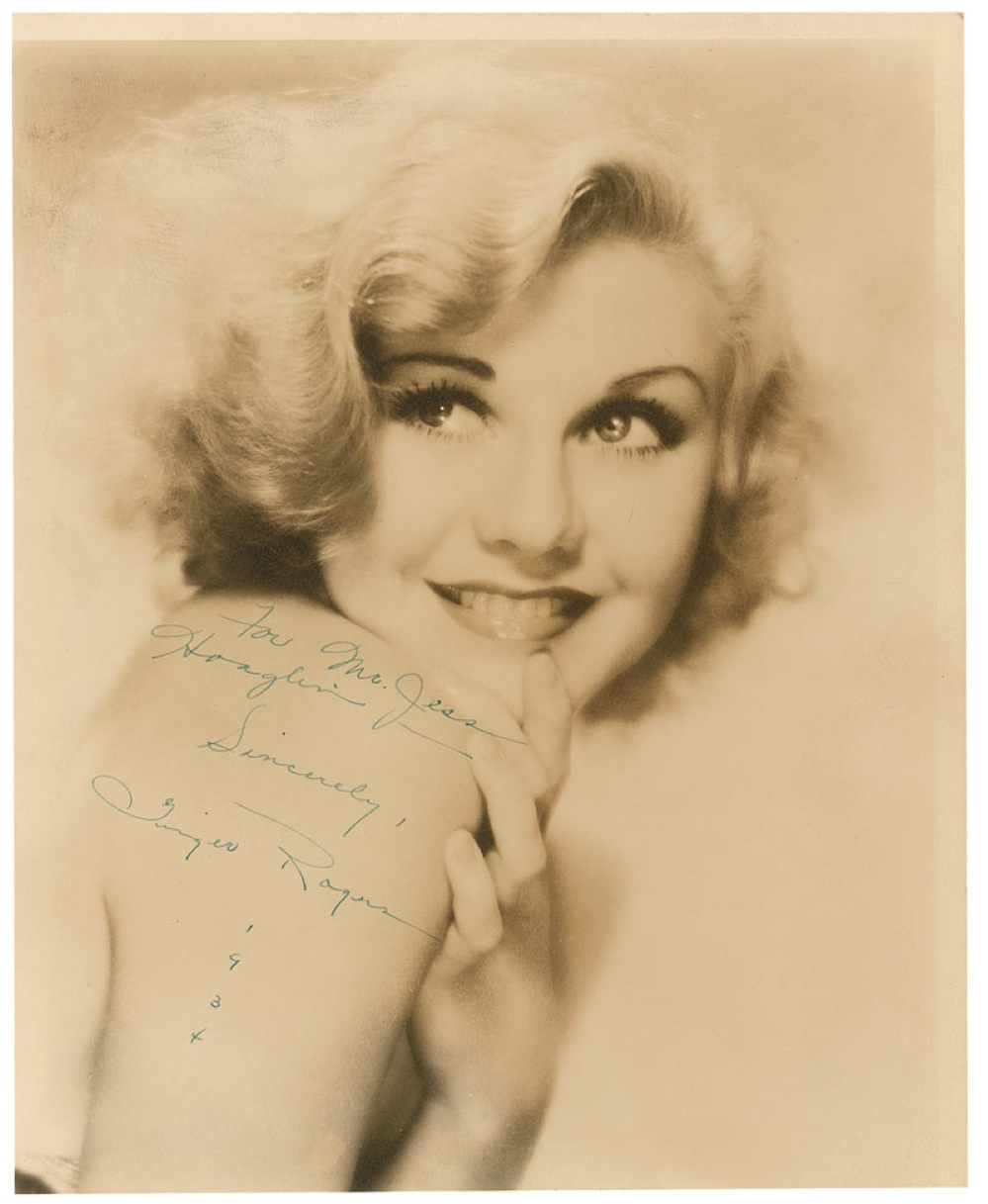 Vintage matte-finish 7.75 x 9.5 photo of Rogers looking over her shoulder, signed and inscribed in green fountain pen “For Mr. Jess Hoaglin, Sincerely, Ginger Rogers 1934.” In fine condition, with two trimmed edges and some light soiling to top left. Pre-certified PSA/DNA and RR Auction COA.