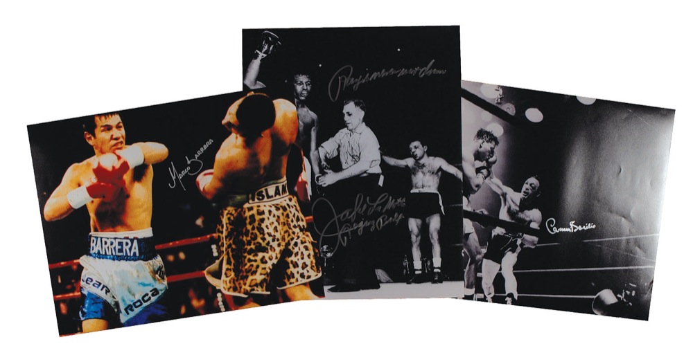 Three satin-finish photos: a 16 x 20 of a pummeled Jake LaMotta, signed in silver ink, “Ray, I never went down. Jake LaMotta, Raging Bull”; a 20 x 16 photo of Carmen Basilio battling Sugar Ray Robinson, signed in silver ink by Basilio; and a color 20 x 16 photo of Marco Barrera in the ring, signed in silver ink. In fine overall condition. RRAuction COA.