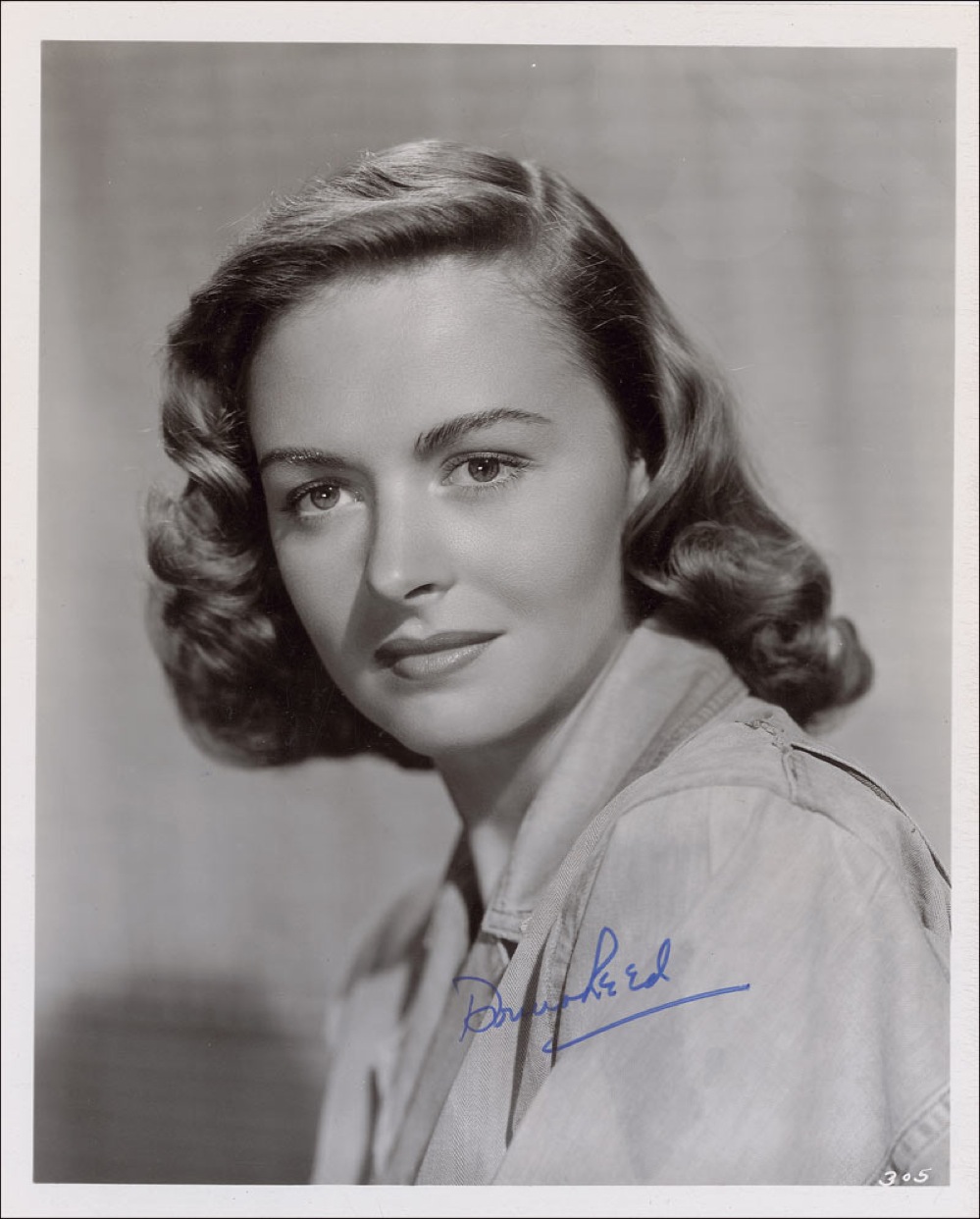 Gorgeous glossy 8 x 10 doubleweight head-and-shoulders photo, signed in blue felt tip, “Donna Reed.” Light rippling along the top edge and a small area of staining from previous water damage, and promo info printed on the reverse, otherwise fine condition. Pre-certified PSA/DNA and RR Auction COA.