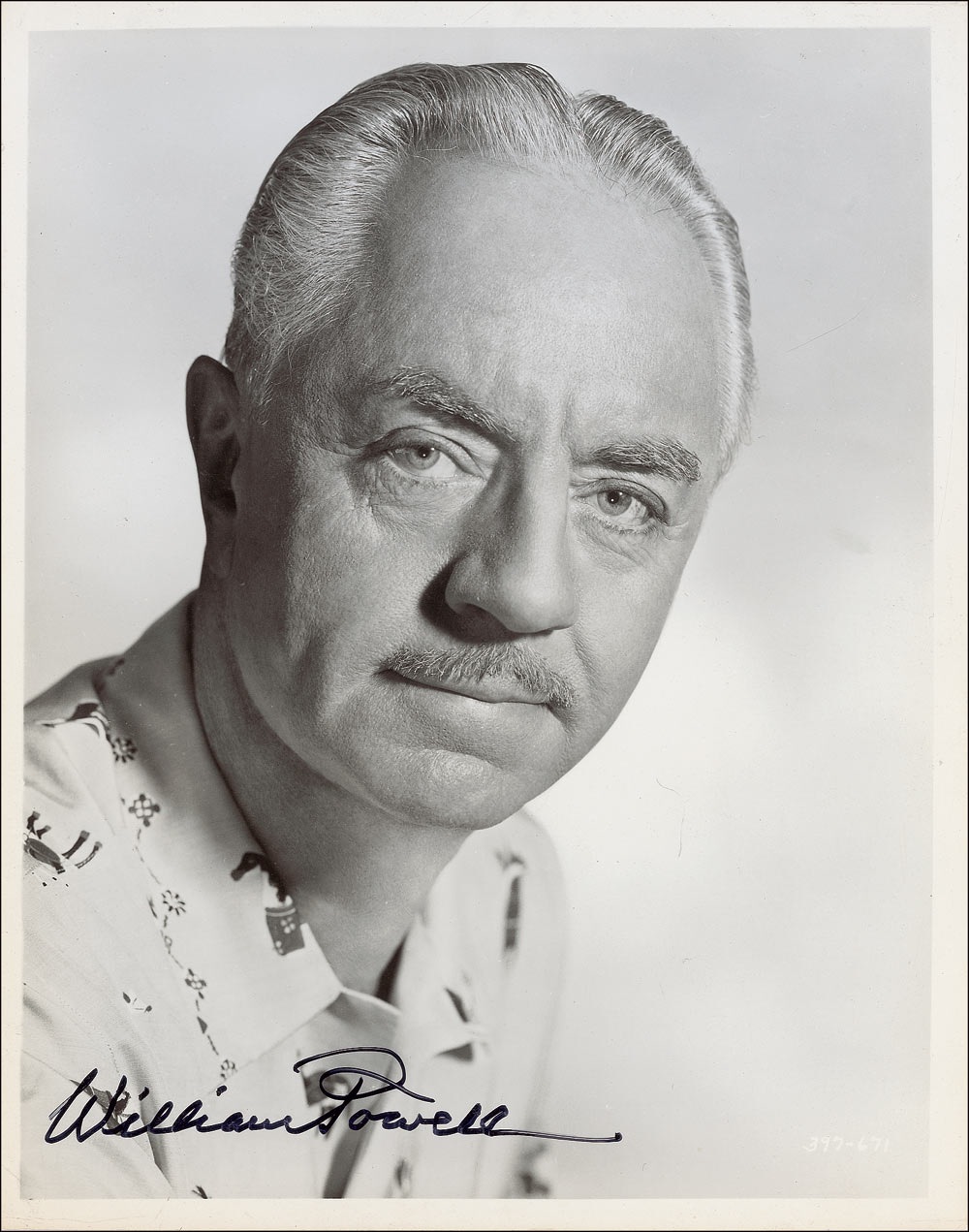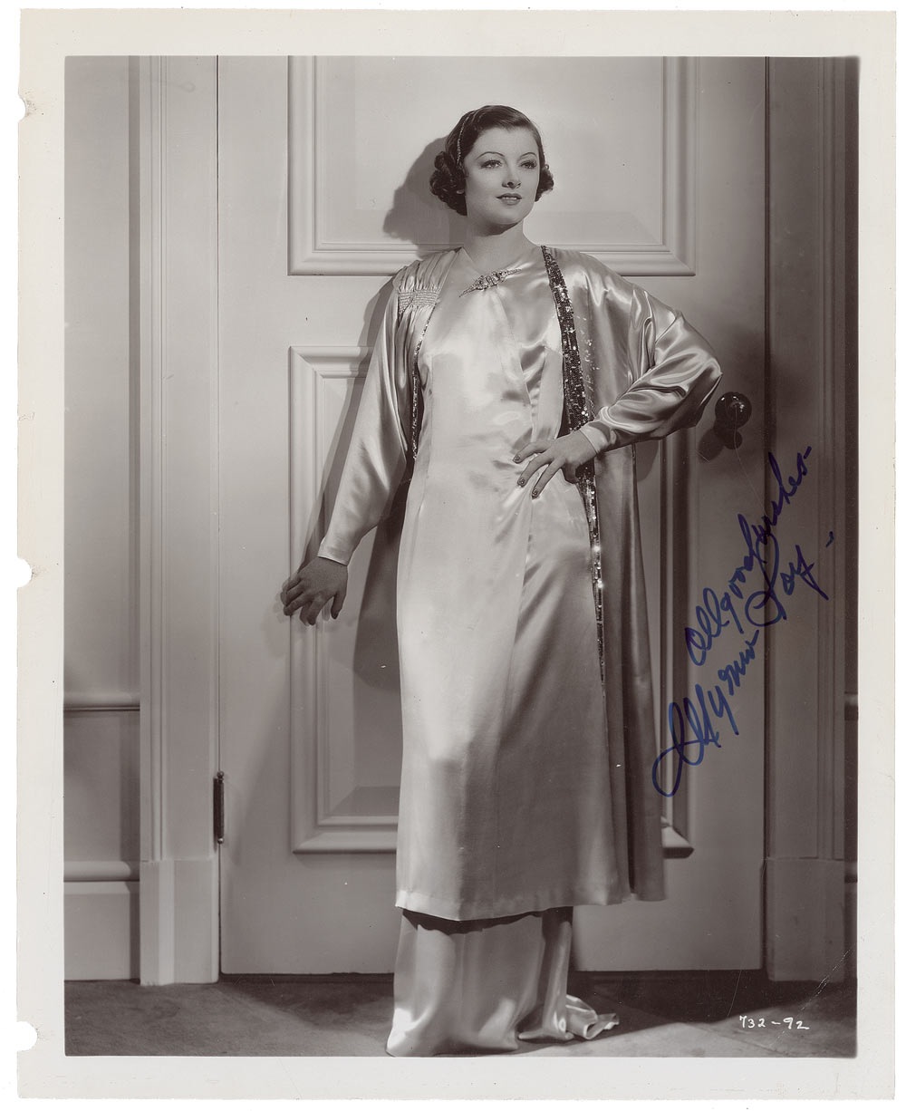 Two glossy 8 x 10 photos, one a handsome head-and-shoulders image of Powell, signed in black felt tip, and the other of Loy in a flowing satin gown, signed in blue felt tip, “All good wishes, Myrna Loy.” Scattered light creasing to both, with a more pronounced crease to the bottom right corner of Loy’s photo, and three partial binder holes and a small tear along the left edge of Loy’s photo, otherwise fine condition. RRAuction COA.