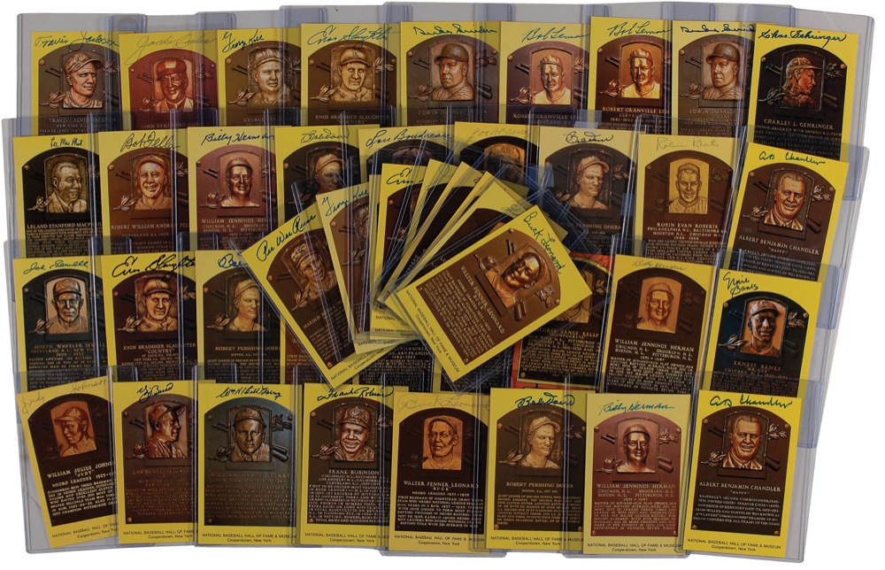 Forty-three gold Hall of Fame plaque cards, each signed on the front in felt tip or ballpoint by the respective Hall of Famer pictured. Signers are: Luke Appling, Earl Averill, Ernie Banks, Yogi Berra, Lou Boudreau, A. B. Chandler (2), Jocko Conlan (2), Bob Doerr (4), Bob Feller, Chas Gehringer, Billy Herman (3), Travis Jackson, Judy Johnson (2), George Kell (2), George Kelly, Bob Lemon (2), Buck Leonard (3), Lee MacPhail, Joe McCarthy, Pee Wee Reese, Robin Roberts, Frank Robinson, Joe Sewell (2), Enos Slaughter (3), Duke Snider (2), Wm. H. (Bill) Terry, and Early Wynn. In fine overall condition. RRAuction COA.
