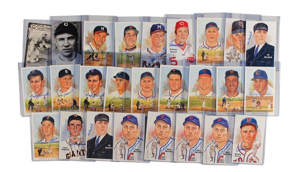 Twenty-four Perez-Steele cards, various series, each signed in felt tip by the respective Hall of Famer pictured. Signers are: Al Barlick (2), Johnny Bench, Bob Doerr, Rick Ferrell (2), Billy Herman (6), Carl Hubbell, Monte Irvin, George Kell, Harmon Killebrew, Bob Lemon, Al Lopez, Juan Marichal, Eddie Mathews (2), Johnny Mize, Joe Sewell, and Billy Williams. Also included is a 3.25 x 5.5 postcard photo of Joe Sewell, signed in ballpoint, and an All Time Greats postcard photo, signed in felt tip by Freddie Lindstrom. In fine condition. RRAuction COA.