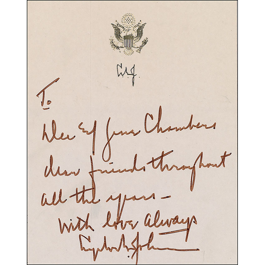 Rare ANS, on an embossed 3.75 x 4.75 bookplate, no date. Short note to Jim Chambers, publisher of the Dallas Times Herald, which had won its only Pulitzer Prize in 1964 for the photograph of Jack Ruby shooting Lee Harvey Oswald. In full: “To Dee and Jim Chambers dear friends throughout all the years. With love always Lyndon B. Johnson.” In fine condition, with light vertical line down left side, inherent to the bookplate, through a single letter of signature. Accompanied by a 1972 TLS from Johnson’s secretary, forwarding the bookplate to Chambers’s secretary, as well as the original mailing envelope, and an engraved visiting card, with “Merry Christmas” written at the top in an unknown hand. Pre-certified John Reznikoff/PSA/DNA and RR Auction COA.
