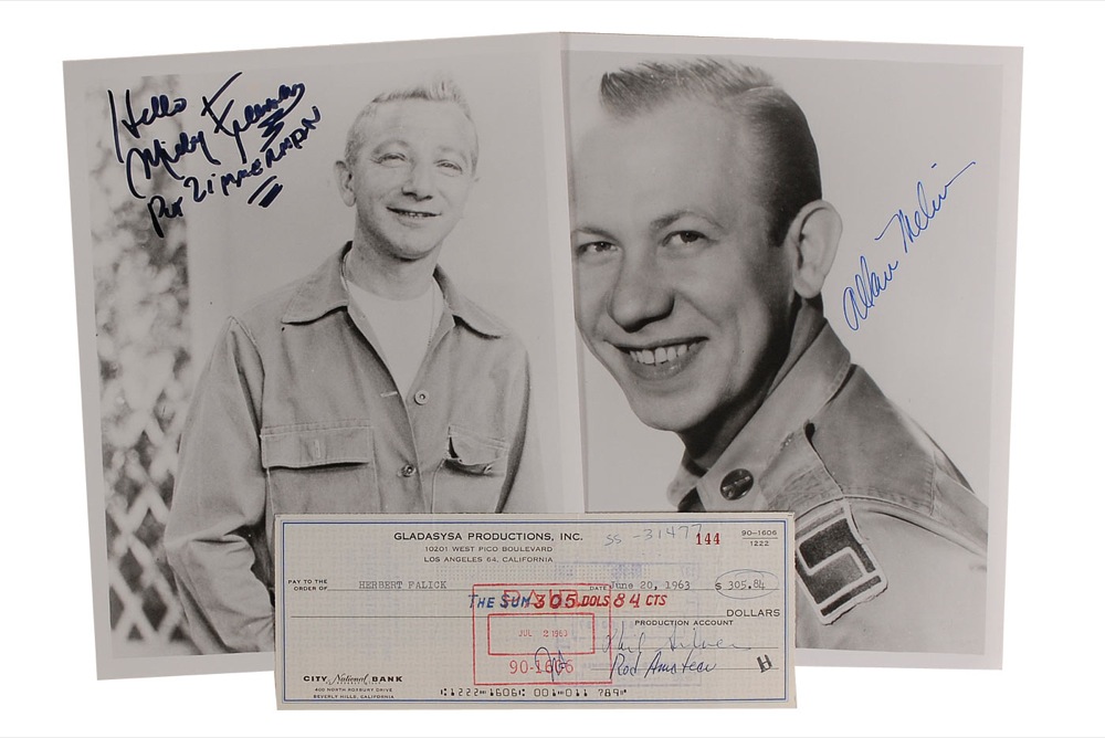 Three items: Gladasysa Productions, Inc. business check, 8.25 x 3, filled out in type and signed by Phil Silvers, payable to Herbert Falick for $305.84, June 20, 1963; glossy 8 x 10 photo of Allen Melvin as Corporal Henshall, signed in blue felt tip; and a glossy 8 x 10 of Mickey Freeman, signed in black felt tip, “Hello, Mickey Freeman, Private Zimmerman.” Three vertical folds and the expected cancellation stamps to the check, the latter of which moderately affects the signature, otherwise fine condition. Accompanied by an unsigned photo of Silvers as Sgt. Bilko. RRAuction COA.