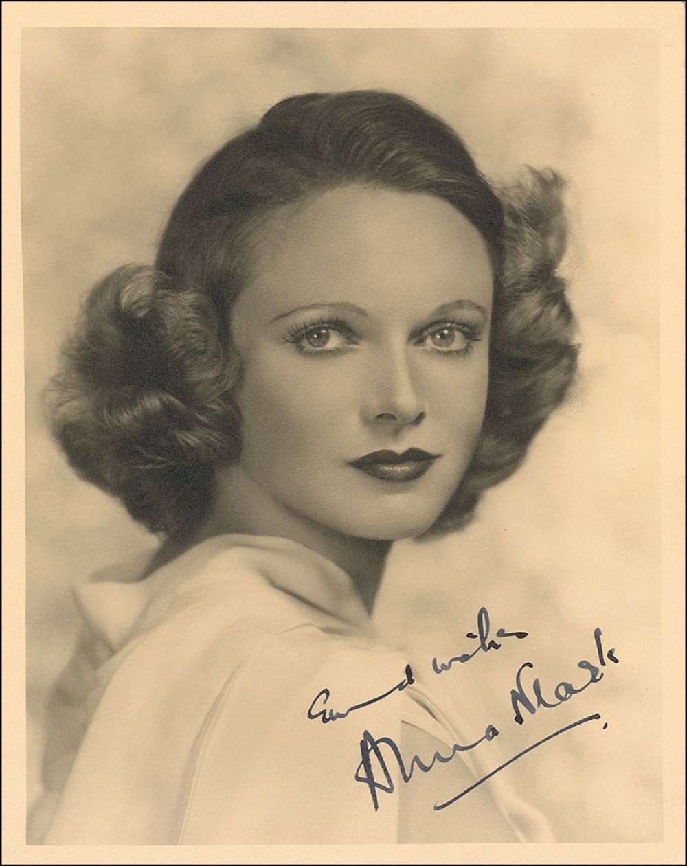 Pretty vintage matte-finish 8 x 10 head-and-shoulders photo, signed in fountain pen, “Good wishes, Anna Neagle.” In fine condition, with light bend to the lower right corner. Pre-certified PSA/DNA and RR Auction COA.