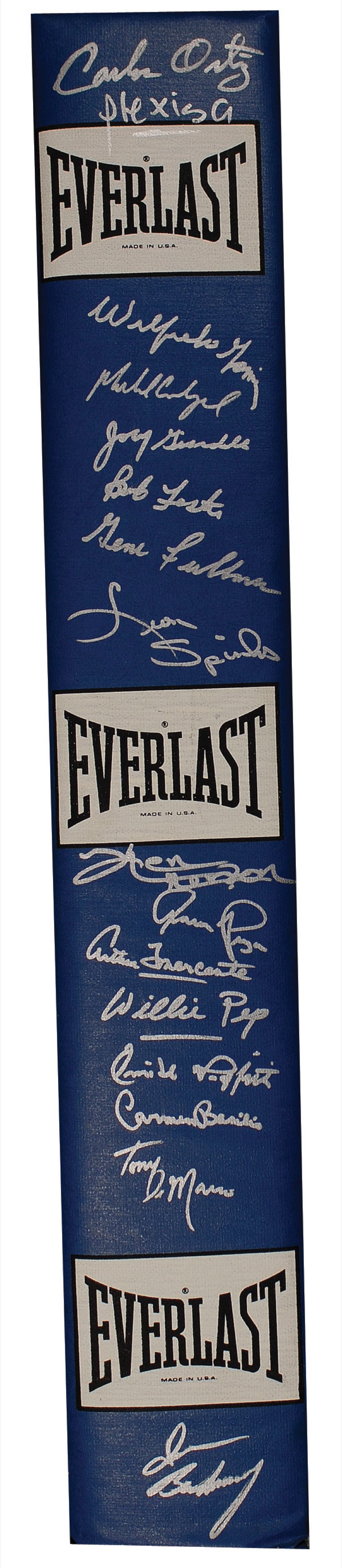 Everlast triangular blue boxing ring corner pad, 47” high, signed in silver ink by 13 boxing greats. Signers are: Carmen Basilio, Carlos Ortiz, Gene Fullmer, Iran Barkley, Emile Griffith, Ken Norton, Wilfredo Gomez, Michael Carbajal, Leon Spinks, Alexis Arguello, Bob Foster, Joey Giardello, and Willie Pep. In fine condition. Accompanied by a certificate of authenticity from the International Boxing Hall of Fame. Pre-certified Steve Grad/PSA/DNA and RR Auction COA.