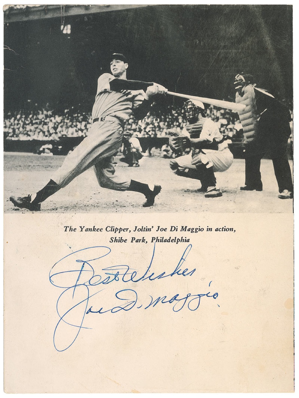 Vintage menu from DiMaggio’s restaurant, measuring 6 x 8 folded, signed on the back cover in blue ballpoint, “Best wishes, Joe DiMaggio.” Scattered light creasing, some mild handling wear, and a bit of scattered light soiling, otherwise fine condition. Accompanied by a letter of authenticity from James Spence. Pre-certified Steve Grad/PSA/DNA and RR Auction COA.