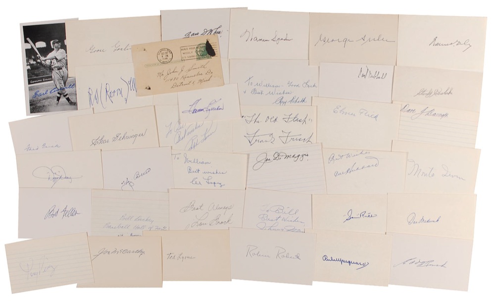 Ink, pencil, and felt tip signatures of 34 Hall of Famers on individual various size cards, with a few adding inscriptions. Signers are: Dave Bancroft, Yogi Berra, Lou Brock, Dizzy Dean, Bill Dickey, Joe DiMaggio, Bob Feller, Elmer Flick, Ford Frick, Frank Frish, Chas. Gehringer, Warren Giles, Goose Goslin, Cal Hubbard, Carl Hubbell, Monte Irvin, Harmon Killebrew, Ralph Kiner, Al Lopez, Ted Lyons, Rube Marquard, Joe McCarthy, Lee MacPhail, Joe Medwick, Johnny Mize, Tony Perez, Sam Rice, Robin Robert, Edd Roush, Ray Schalk, Warren Spahn, Wm. H. (Bill) Terry, Lloyd Waner, and Zack Wheat. In fine condition, with some scattered light toning and slight brushing to a couple of signatures. Also accompanied by a postcard photo of Earl Averill, signed in blue felt tip. RRAuction COA.