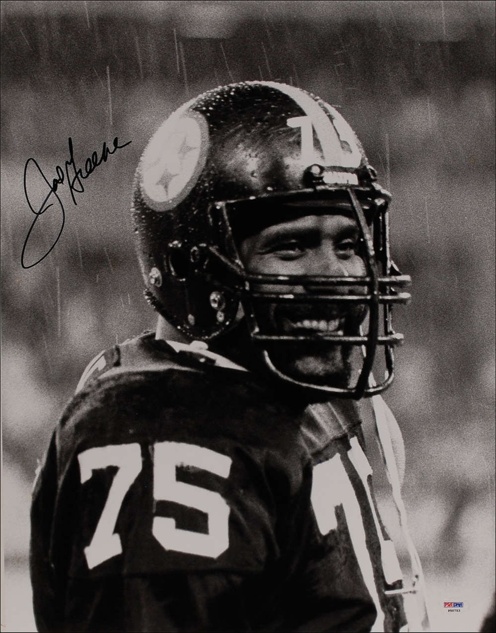 Glossy 16 x 20 photo of Greene smiling during a downpour, signed in black felt tip. In fine condition, with a PSA/DNA authentication label affixed to lower corner. RRAuction COA.