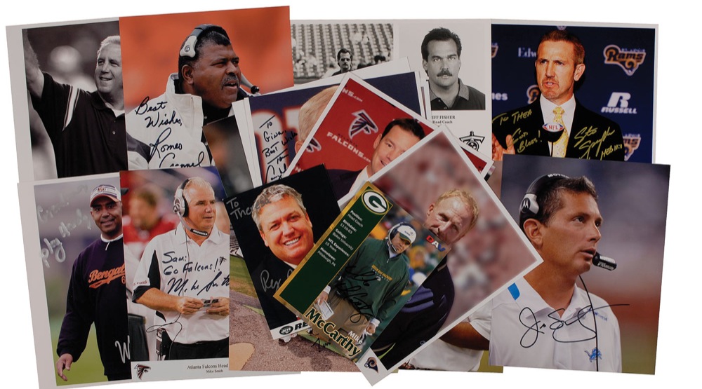 Collection of 22 signed photos, ranging in size from 5 x 7 up to 8 x 10, various finishes, some color, each signed in ink or felt tip by the respective coach pictured. Signers are: Mike McCarthy, Rex Ryan (ins), Ken Whisenhunt, John Fox, Eric Mangini, Jeff Fisher, Pete Carroll (2), Tom Coughlin, Steve Spagnuolo (ins), Marvin Lewis (ins), Gary Kubiak (3), Mike Shula, Tommy Bowden, Jim Schwartz, Jim Mora, Mike Smith (ins), and Romeo Crennel (3). In fine condition. RRAuction COA.