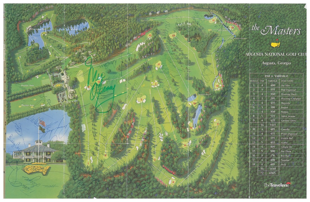 Aerial map featuring the sprawling greens at Augusta, signed by a plethora of golf masters