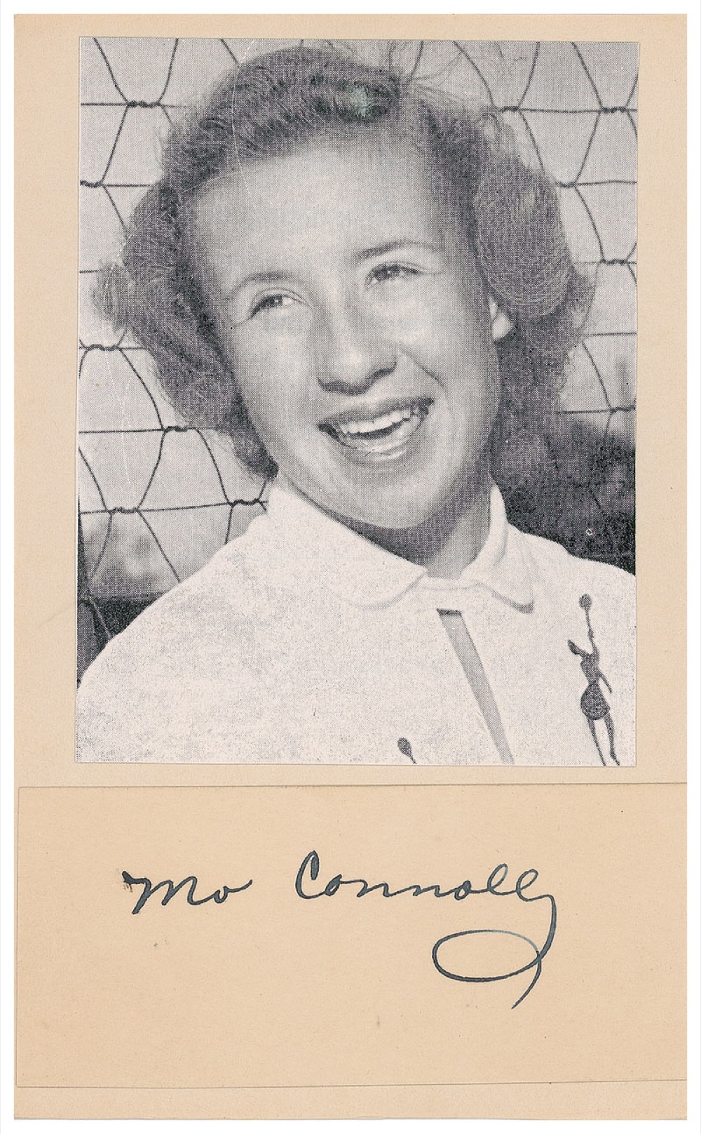 International Tennis Hall of Famer (1934-1969) known as ‘Little Mo,’ she was the first woman to win the Grand Slam. Retiring at age 20, she died prematurely fifteen years later. Vintage fountain pen signature, “Mo Connolly,” on an off-white 3.5 x 1.75 card affixed to a larger card with a great close-up photo of the tennis legend. In fine condition, with trimmed edges. Pre-certified Steve Grad/PSA/DNA and RR Auction COA.