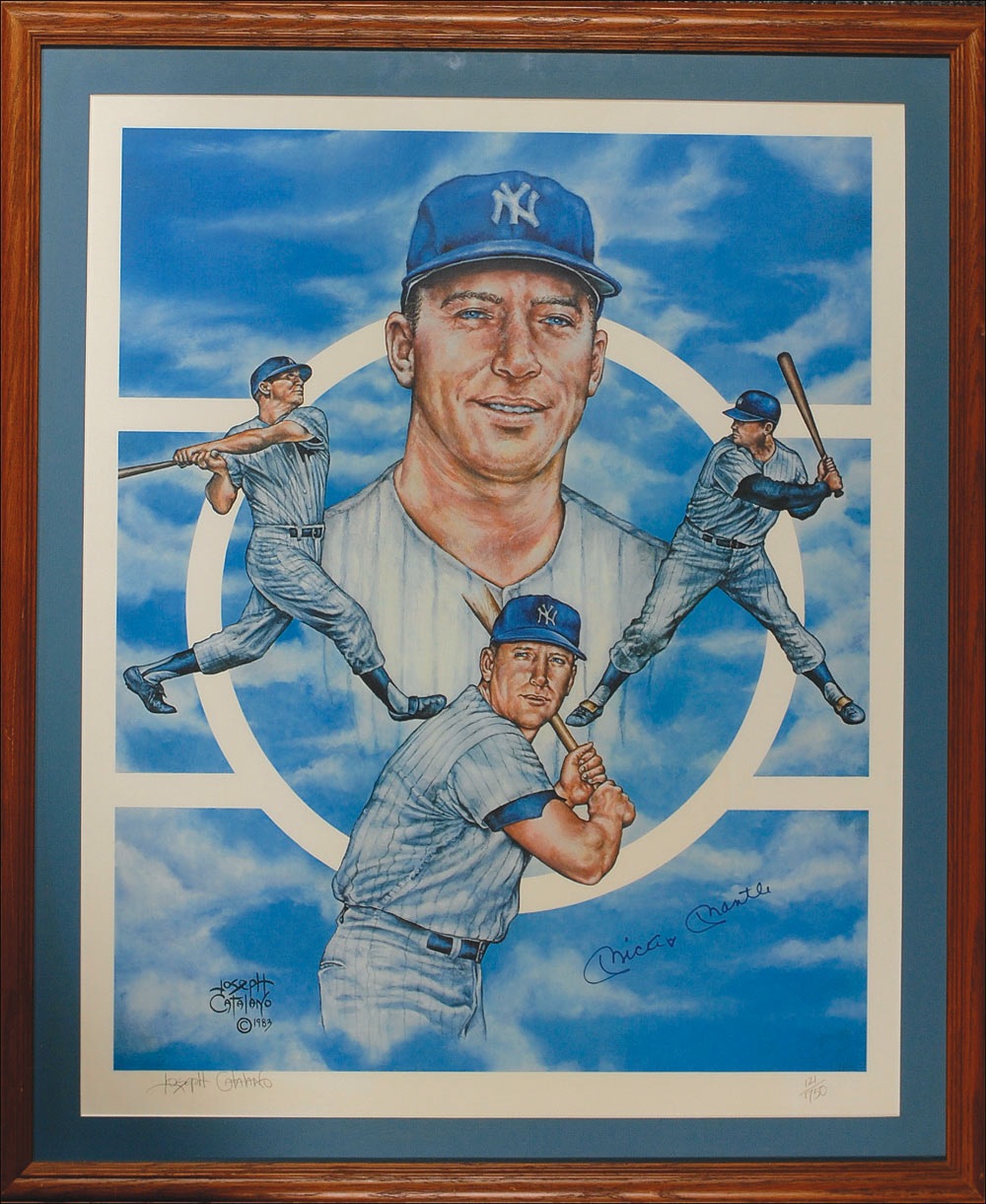Color limited edition 21.5 x 26.5 composite print, numbered #121/750, signed in blue felt tip by Mantle. Also signed in pencil by the artist, Joseph Catalano. Matted and framed to an overall size of 26.5 x 32. In fine condition. Oversized. Pre-certified Steve Grad/PSA/DNA and RR Auction COA.
