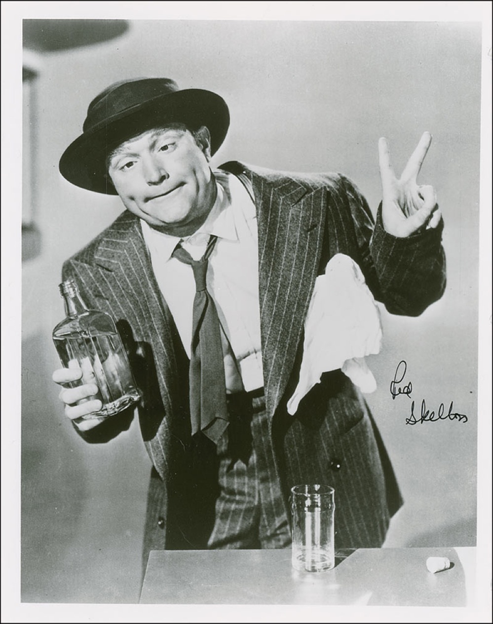 Glossy 8 x 10 photo of Skelton as an inebriated character, signed in black felt tip. In fine condition, with binder dings to right edge. Pre-certified PSA/DNA and RR Auction COA.