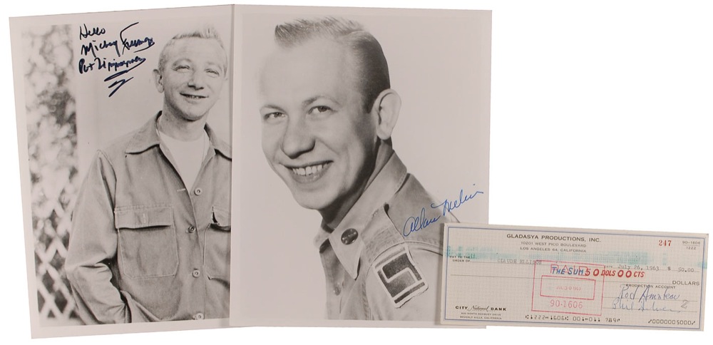 Three items: Gladasya Productions Inc. business check, 8.25 x 3, filled out in type and signed by Phil Silvers, payable to Claude Ellison for $50.00, dated July 26, 1963; a glossy 8 x 10 photo of Allan Melvin, signed in blue felt tip; and a glossy 8 x 10 photo of Mickey Freeman, signed in black felt tip and adding his character name. In fine condition, with a couple light corner creases to signed photos and expected stamps to check, none affecting the signature area. Accompanied by an unsigned photo of Silvers as Sgt. Bilko. RRAuction COA.