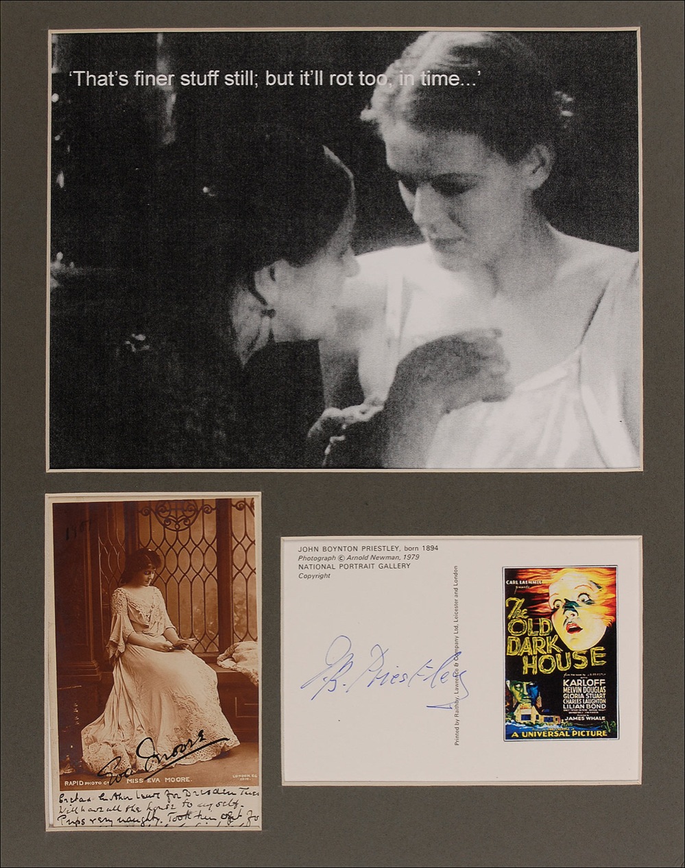 Vintage postcard photo of Eva Moore, signed in fountain pen; and an ink signature, “J. B. Priestley,” on the correspondence side of an Old Dark House picture postcard. Matted with a photo from the film, to an overall size of 11 x 14. In fine condition, with notations in another hand to lower border of Moore’s photo, as well as a notation to upper left. Pre-certified PSA/DNA and RR Auction COA.