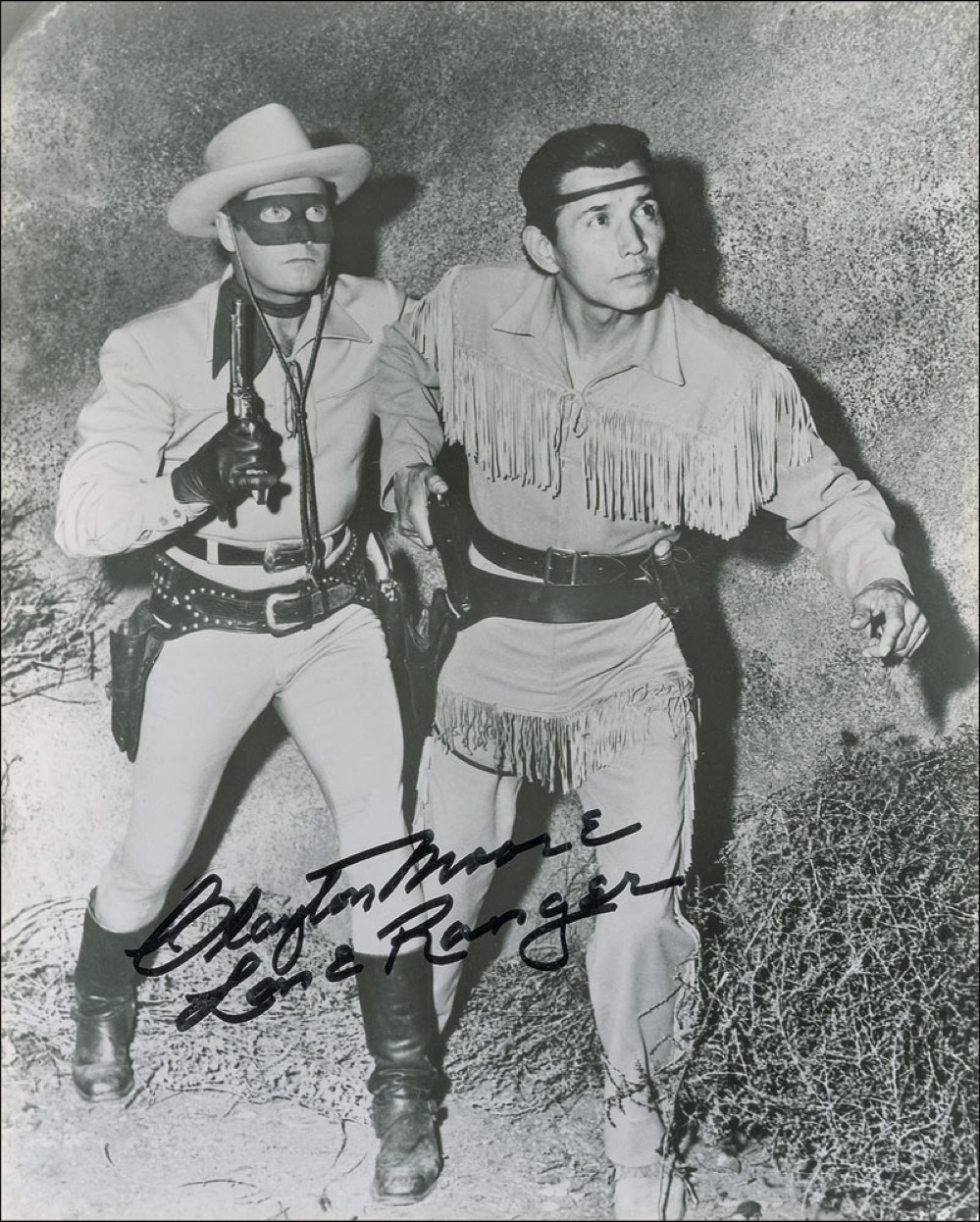 Two glossy 8 x 10 photos, one of the Lone Ranger atop Silver, the other of the Lone Ranger and Tonto, each signed in black felt tip, “Clayton Moore, Lone Ranger.” In fine condition. RRAuction COA.