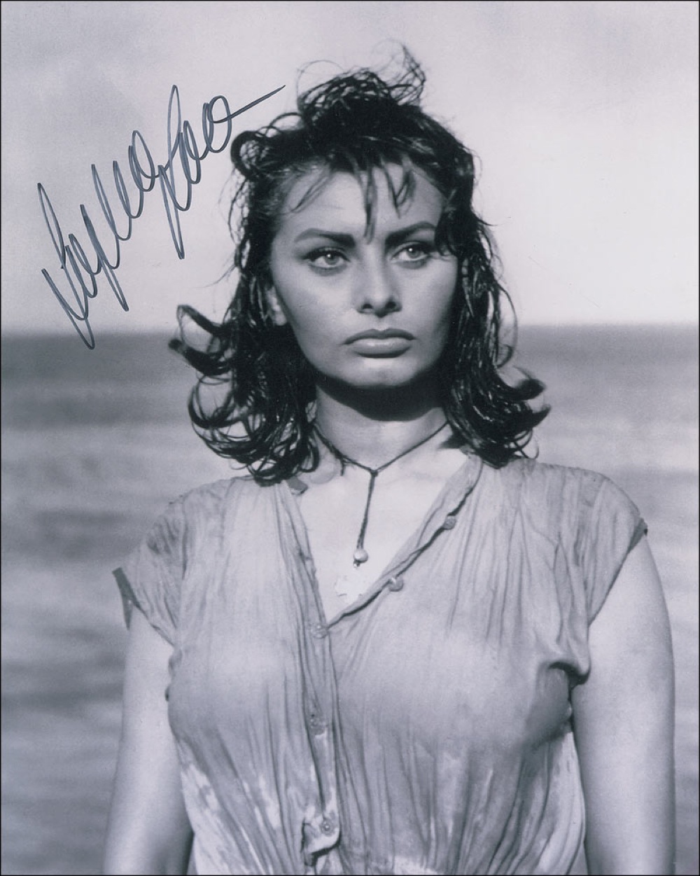 Two satin-finish 8 x 10 photos, one of Loren in black lingerie, and the other of the actress looking none too happy about her wet dress, both signed in black felt tip. In fine condition. Pre-certified PSA/DNA and RR Auction COA.