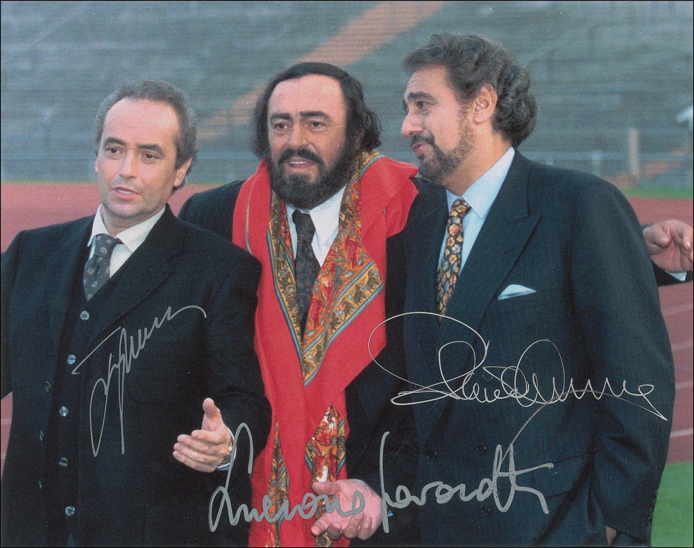 Color glossy 10 x 8 photo of the three vocalists posing at a running track, signed in silver ink by Luciano Pavarotti, Placido Domingo, and Jose Carreras. In fine condition. Pre-certified PSA/DNA and RR Auction COA.