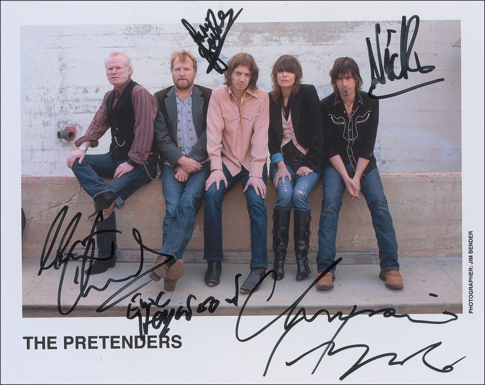 Color glossy 10 x 8 promotional group photo, signed in black felt tip by Chrissie Hynde, Martin Chambers, James Walbourne, Eric Heywood, and Nick Wilkinson. In fine condition, with light brushing to Wilkinson’s signature. RRAuction COA.