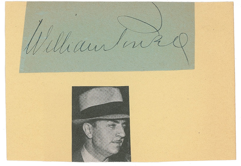 Vintage ink signature, “William Powell,” on a light green 3.75 x 1.5 trimmed album page, affixed to a larger light yellow album page along with a small clipped photo. In fine condition, with a bit of scattered light toning. Pre-certified PSA/DNA and RR Auction COA.