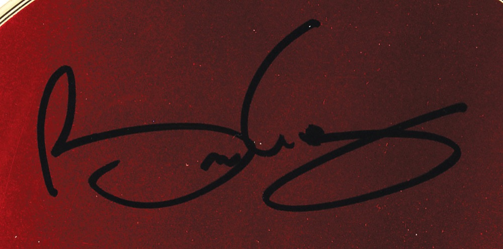 Scarce 2006 UK 'Mini May' half size Signature electric guitar based on the uniquely famous 'Red Special' guitar. This half sized model is fully functioning and playable including 24 frets but no zero fret featuring a single pickup and no switches, has a solid body with a vintage Cherry finish and a maple neck with Brian May Signature decal on the headstock, also includes 1 x single coil pickup, volume and tone control chrome hardware & tuners. This particular guitar has been autographed by Brian May on the body in a blue sharpie, also includes a mini guitar gig bag - truly stunning item, ideal for display; and a 45 rpm picture single for 'Under Pressure (Rah Mix),' signed on the portrait side in blue felt tip. In fine condition, with mild spreading of ink on record. Pre-certified Roger Epperson/REAL and RR Auction COA.