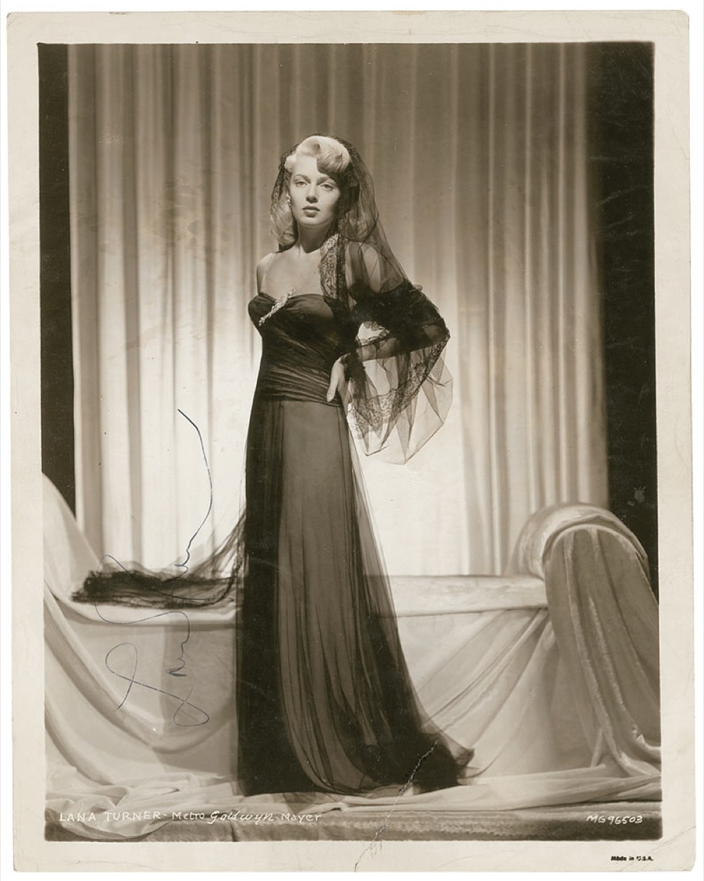 Vintage glossy 8 x 10 full-length photo of Turner dressed in black, signed in fountain pen. In good condition, with repaired tear to bottom edge, scattered creases and surface marks, mild overall rippling, some light contrast and irregular ink adhesion to signature, and some discoloration to background. Pre-certified PSA/DNA and RR Auction COA.