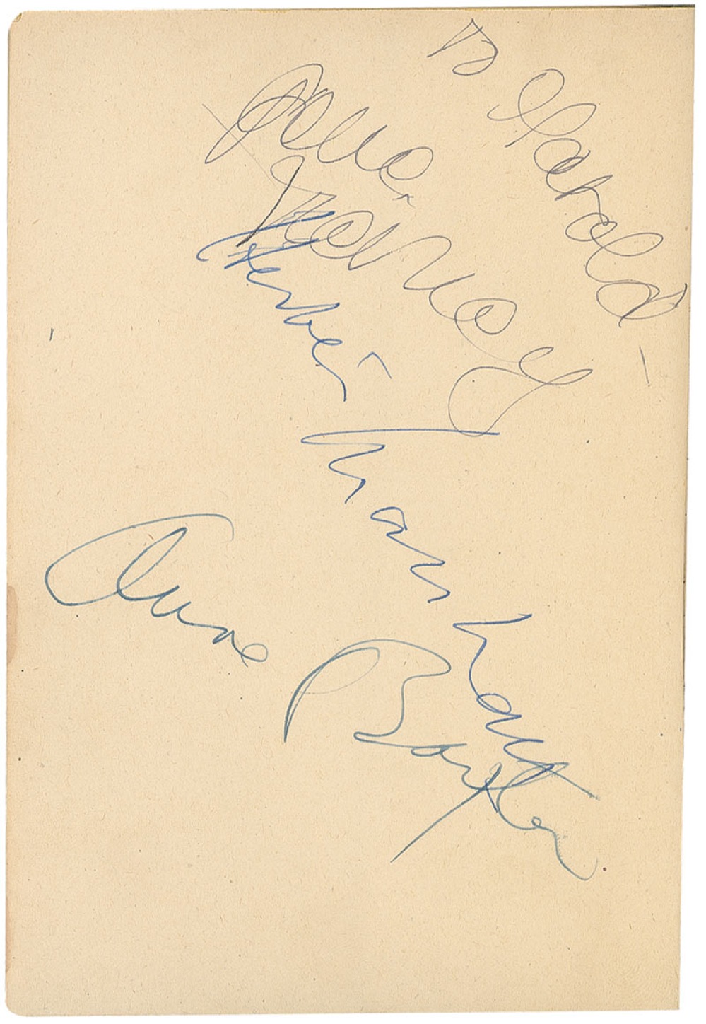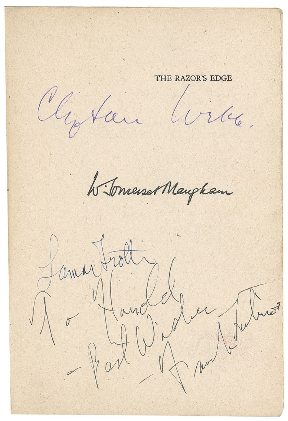 Signed book: The Razor’s Edge. Later printing. Philadelphia: The Blakiston Company, 1945. Hardcover, 5.5 x 8, 246 pages. Signed in ink on the reverse of the first free end page, the half-title page, and the back pages by 14 actors and actresses, including, Gene Tierney (ins), Anne Baxter, Clifton Webb, Herbert Marshall, Frank Latimore (ins), Cesar Romero (ins), Cedric Hardwicke (ins), George Montgomery (ins), June Haver, Carole Landis, Alice Faye (Harris), John Sutton, and Lamar Trotti (screenwriter). A facsimile signature of the books author, W. Somerset Maugham, is also featured. In very good condition, with a uniform shade of toning to the opening and ending pages, toning to the corners, a loose, but intact hinge, and moderate wear to the cover. Pre-certified PSA/DNA and RR Auction COA.