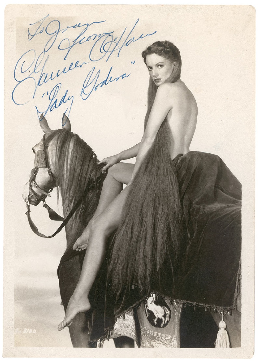 Matte-finish 5 x 7 photo of a nude O’Hara on horseback as Lady Godiva, signed and inscribed in blue ballpoint, “To Joan, from Maureen O’Hara, ‘Lady Godiva.’” Some mild corner creasing, light silvering to the darker areas of the image, and mounting remnants to the reverse, otherwise fine condition. Pre-certified PSA/DNA and RR Auction COA.