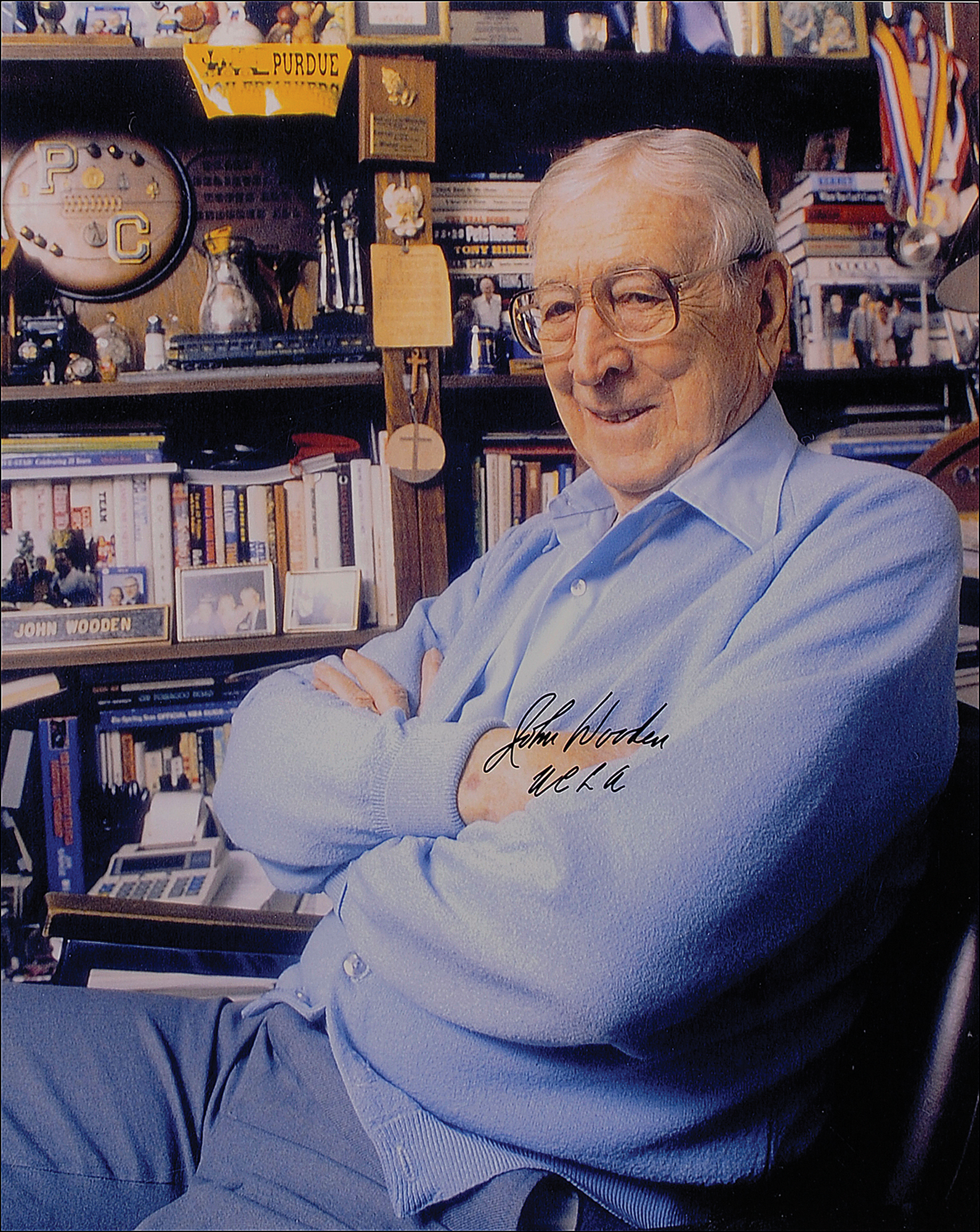 Color glossy 16 x 20 photo of an elderly Wooden in his office, signed in black felt tip. In fine condition.