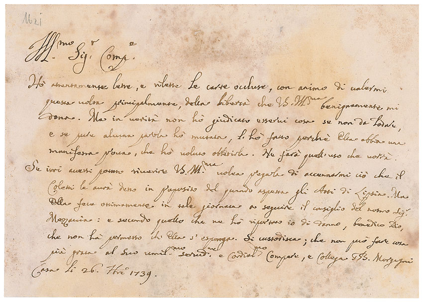 Italian anatomist (1682–1771) celebrated as the father of modern anatomical pathology. ALS in Italian, signed “G. B. Morgagni,” one page, 8 x 5.5, September 26, 1739. Letter to an associate. In full (translated): “I have carefully read and reread the enclosed papers with the intention of availing myself of the liberty you gave me so generously to modify it. But in truth I have only found matter to praise and if any word have I changed I did it because I wanted to obey your clear meaning. Please use it as you wish. Had I had the opportunity of seeing you yesterday I would have asked what opinion did Calemi give you on what was said in the printed Acts of Leipzig. But I believe you did right in such circumstance to follow the advice of Mr. Mezzanino and from what I can gather I thank God for having prevented you from being exposed. Please take good care of yourself and you will greatly oblige your very humble servant and cordial friend and colleague.” Central vertical fold, small pencil notation to top left, and scattered toning and foxing, otherwise fine condition. RRAuction COA.