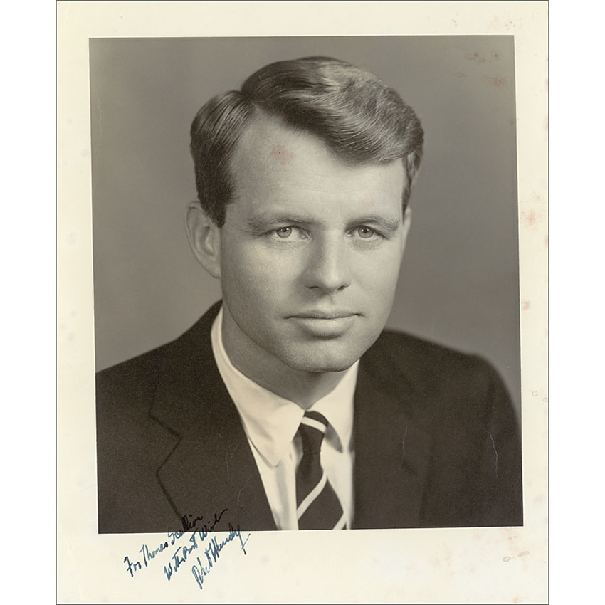 Vintage matte-finish 8 x 10 photo, signed and inscribed in fountain pen “For Thomas Sullivan, With best wishes, Robert F. Kennedy.” In very good condition, with scattered foxing to borders and image, scattered surface creases, and light contrast to portion of inscription. Pre-certified PSA/DNA and RR Auction COA.