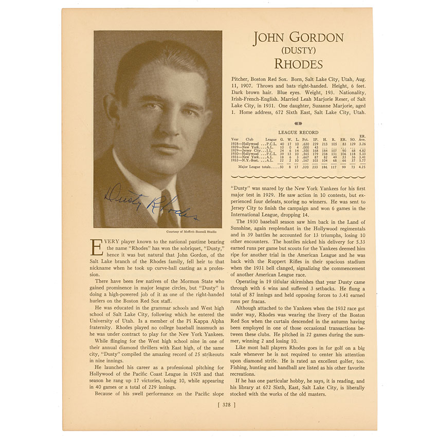 Major League pitcher who played for the Yankees from 1929–1932. Scarce vintage book page from Who’s Who, 8.25 x 11, signed in blue ink. In fine condition, with trimmed right edge and a uniform shade of mild toning. Pre-certified Steve Grad/PSA/DNA and RR Auction COA.