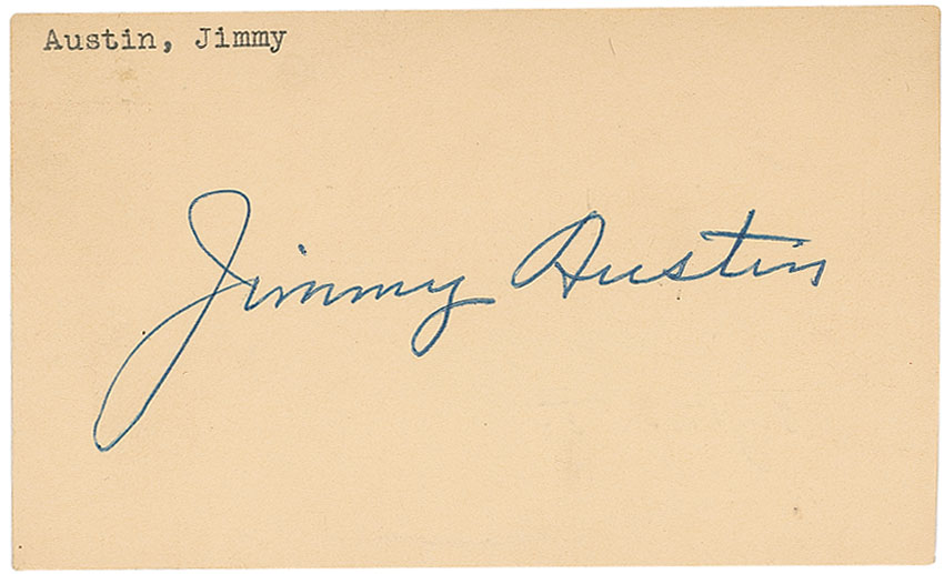 Baseball infielder immortalized in the Charles M. Conlon photo as the third baseman trying to avoid Ty Cobb's spikes on a stolen base. Vintage ballpoint signature, “Jimmy Austin,” on a 5 x 3 trimmed government postcard (postmarked April 18), with typed collector’s notation along the top. In fine condition, with trimmed edges and a bit of trivial soiling. Pre-certified Steve Grad/PSA/DNA and RR Auction COA.