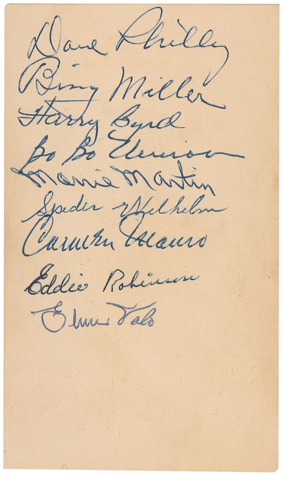 Vintage ballpoint signatures of nine members of the 1953 Philadelphia A’s on an off-white 3.25 x 5.5 government postcard (postmarked 9/21/1953). Signers are: Harry Byrd, Bobo Newsom, Eddie Robinson, Elmer Valo, Dave Philley, Bing Miller, Spider Wilhelm, Morrie Martin, and Carmen Mauro. In fine condition, with a bit of scattered light toning and soiling. Pre-certified Steve Grad/PSA/DNA and RR Auction COA.