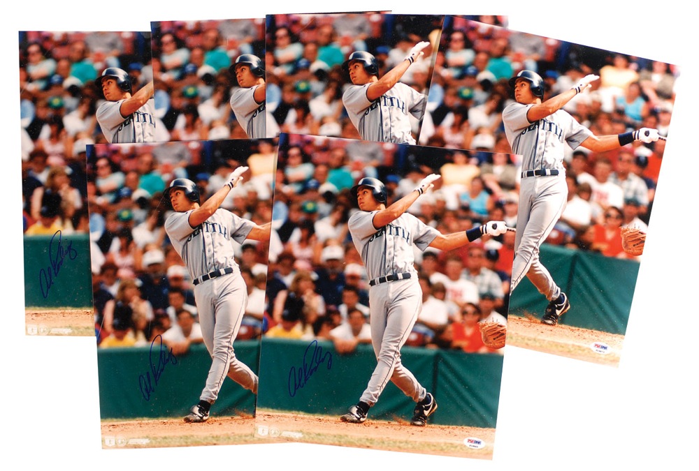 Six color glossy 11 x 14 photos of Rodriguez at the plate for the Seattle Mariners, each signed in blue felt tip. Some scattered light bends and creasing, spotting to finish, and a PSA/DNA authentication label affixed to lower corner of each photo, otherwise fine condition. Accompanied by certificates of authenticity from PSA/DNA. RRAuction COA.