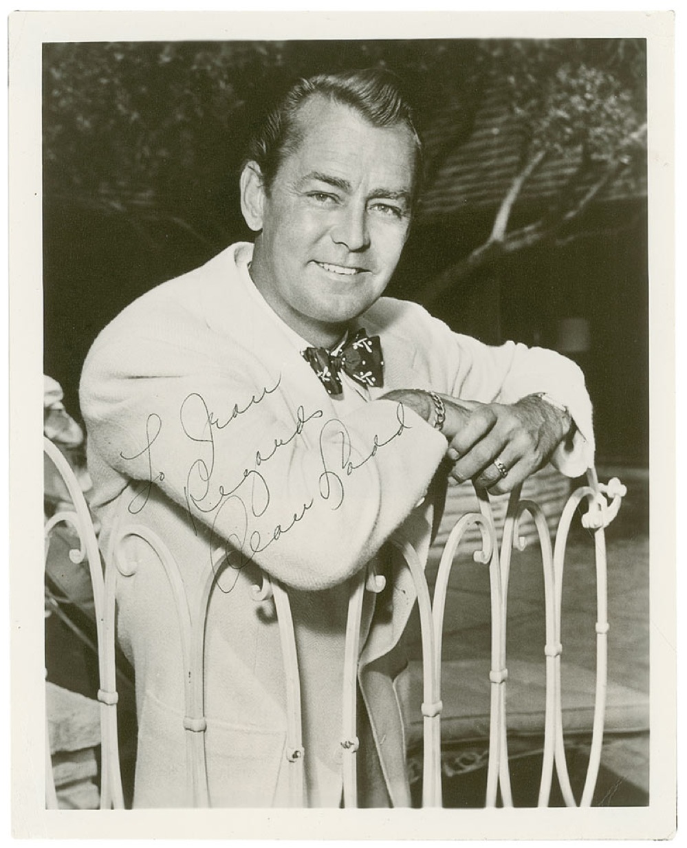 Vintage matte-finish 8 x 10 photo of Ladd leaning against a fence, signed and inscribed in ballpoint, “To Jean, Regards, Alan Ladd.” In fine condition, with corner creasing and paperclip impression to the top. Pre-certified PSA/DNA and RR Auction COA.