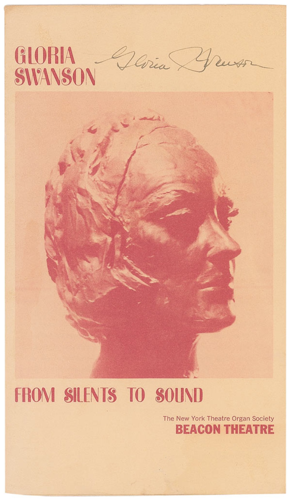 Program for the New York Theatre Organ Society’s presentation of From Silents to Sound at the Beacon Theatre on May 8, 1967, tri-fold, 6.25 x 11, signed in the top border in fountain pen, “Gloria Swanson.” In fine condition, with a few light spots of scattered creasing and soiling, and four pieces of adhesive remnant on the back of the last page. Pre-certified PSA/DNA and RR Auction COA.