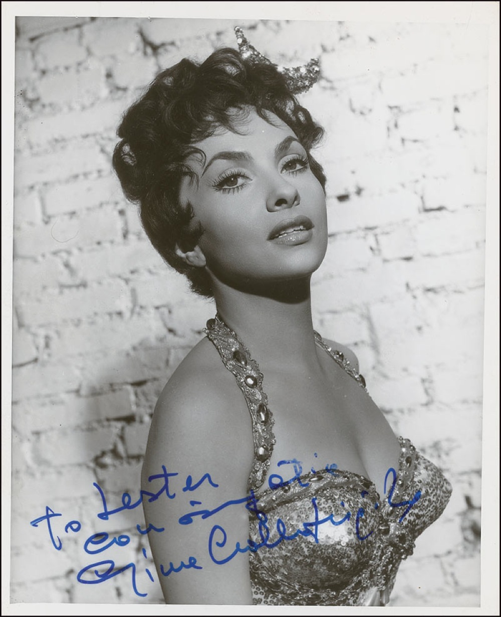 Ravishing glossy 8 x 10 head-and-shoulders photo of Lollobrigida in a sequined top, signed and inscribed in blue felt tip. In fine condition, with scattered creases and impressions, including some over the facial area, and slightly irregular ink adhesion to the end of the sentiment. Pre-certified PSA/DNA and RR Auction COA.