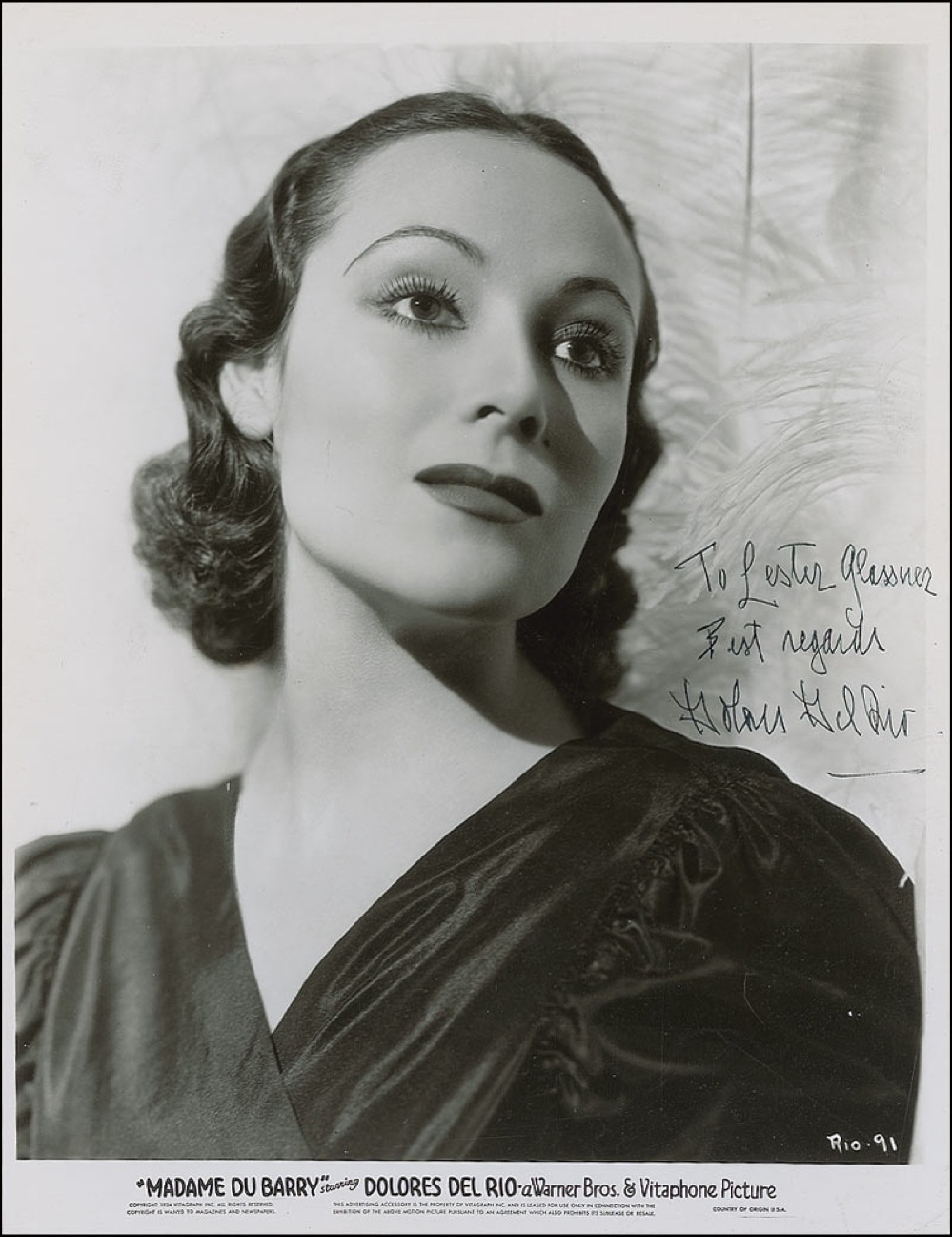 Captivating vintage glossy 8 x 10 promotinal photo for Madame Du Barry, signed and inscribed in fountain pen, “To Lester Glassuer, Best regards, Dolores Del Rio.” In fine condition, with scattered light surface creasing and two faint paperclip imprints along the top edge. Pre-certified PSA/DNA and RR Auction COA.