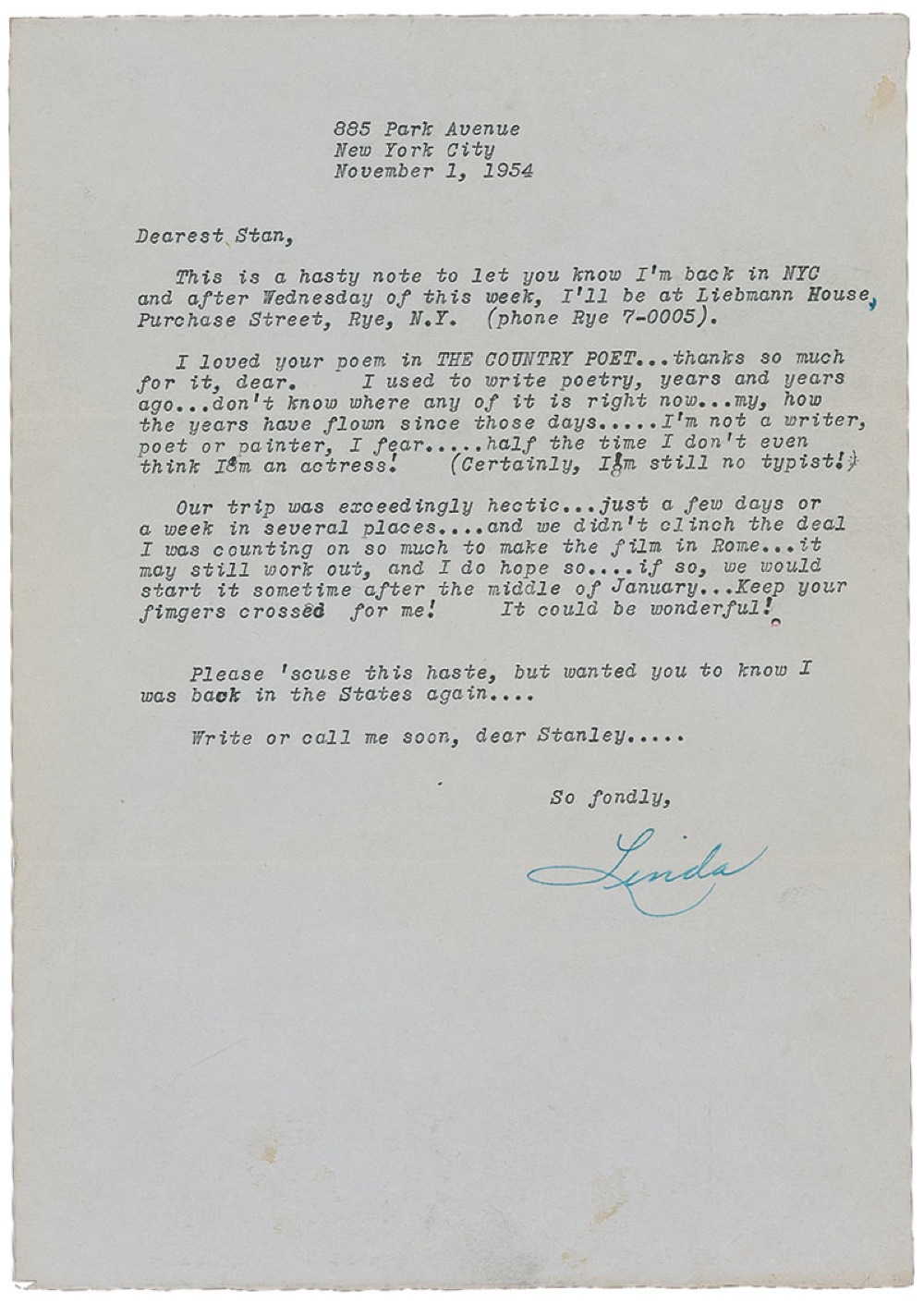 TLS, signed “Linda,” one page, 7.25 x 10, November 1, 1954. Letter to Stan Woodward reads, in part: “Our trip was exceedingly hectic…and we didn’t clinch the deal I was counting on so much to make the film in Rome…and it still may work out, and I do hope so.” Accompanied by the original mailing envelope; and a picture postcard of New York City, signed on the reverse, “L.D.,” dated April 8, 1956. Letter to Woodward reads, in part: “Peregrinations will keep me here ‘til April 16th…Many exciting experiences just lately in the ‘Theatuh.’” Light soiling and horizontal fold passing through signature on TLS, otherwise fine condition. Pre-certified PSA/DNA and RR Auction COA.