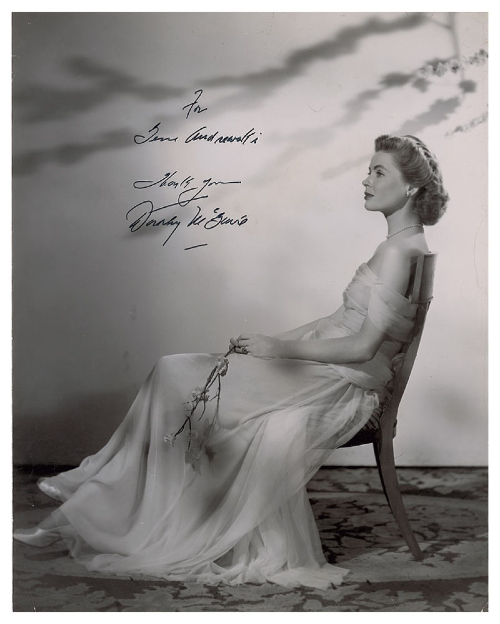 Vintage glossy 10.5 x 13.25 20th Century Fox publicity photo, signed and inscribed in black ink “To Gene Andrewski, Thank you, Dorothy McGuire.” Publicity caption is taped to reverse. In very good condition, with scattered bends and creases, trimmed edges, and mild rippling to finish. Pre-certified PSA/DNA and RR Auction COA.