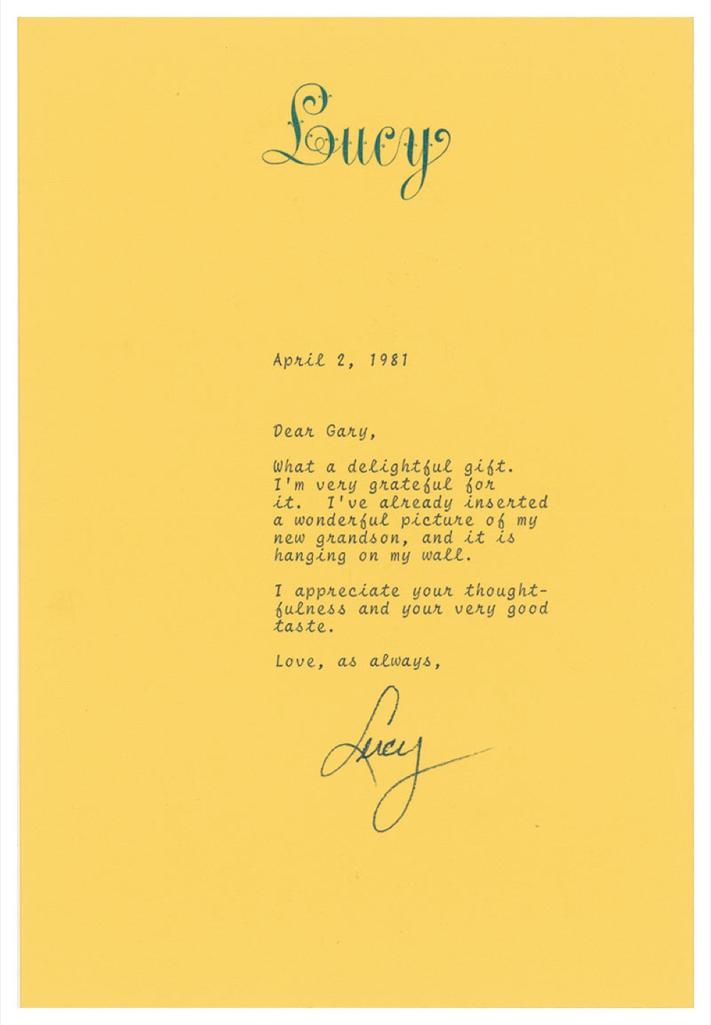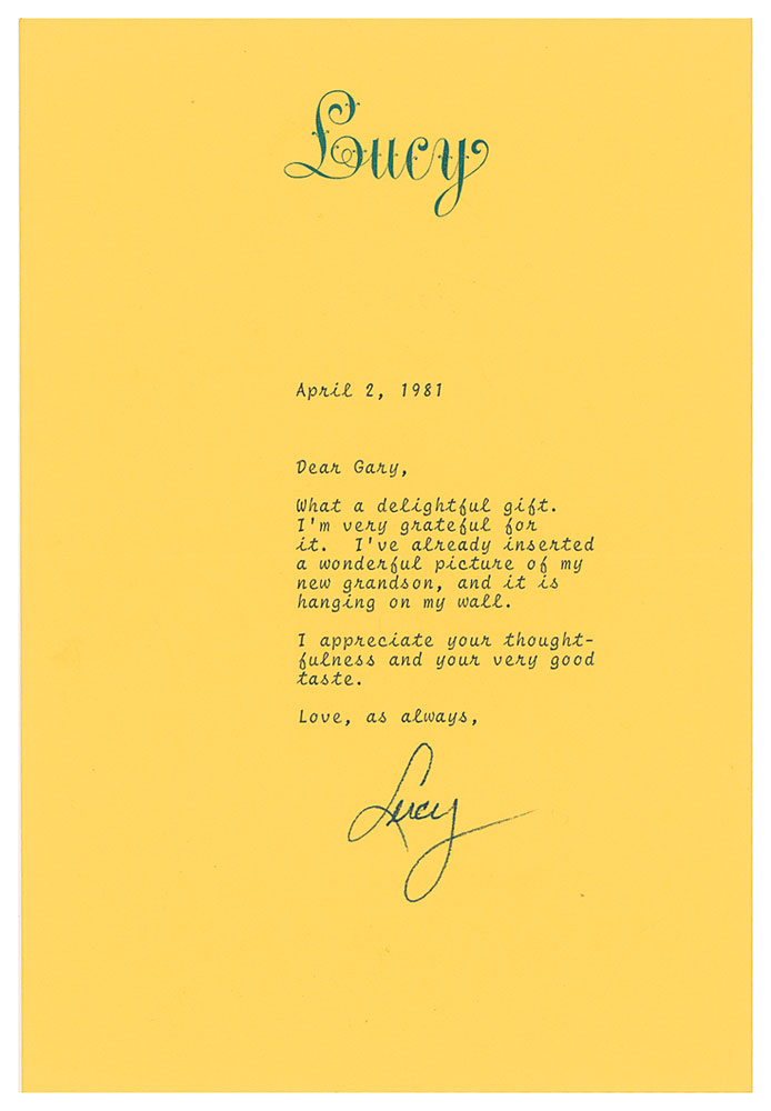 TLS signed “Lucy,” one page, 6.25 x 9.25, personal letterhead, April 2, 1981. Short letter of thanks for a picture frame sent by an admirer. In part: “I’m very grateful for it. I’ve already inserted a wonderful picture of my new grandson, and it is hanging on my wall.” In fine condition. Accompanied by the original mailing envelope. Pre-certified PSA/DNA and RR Auction COA.