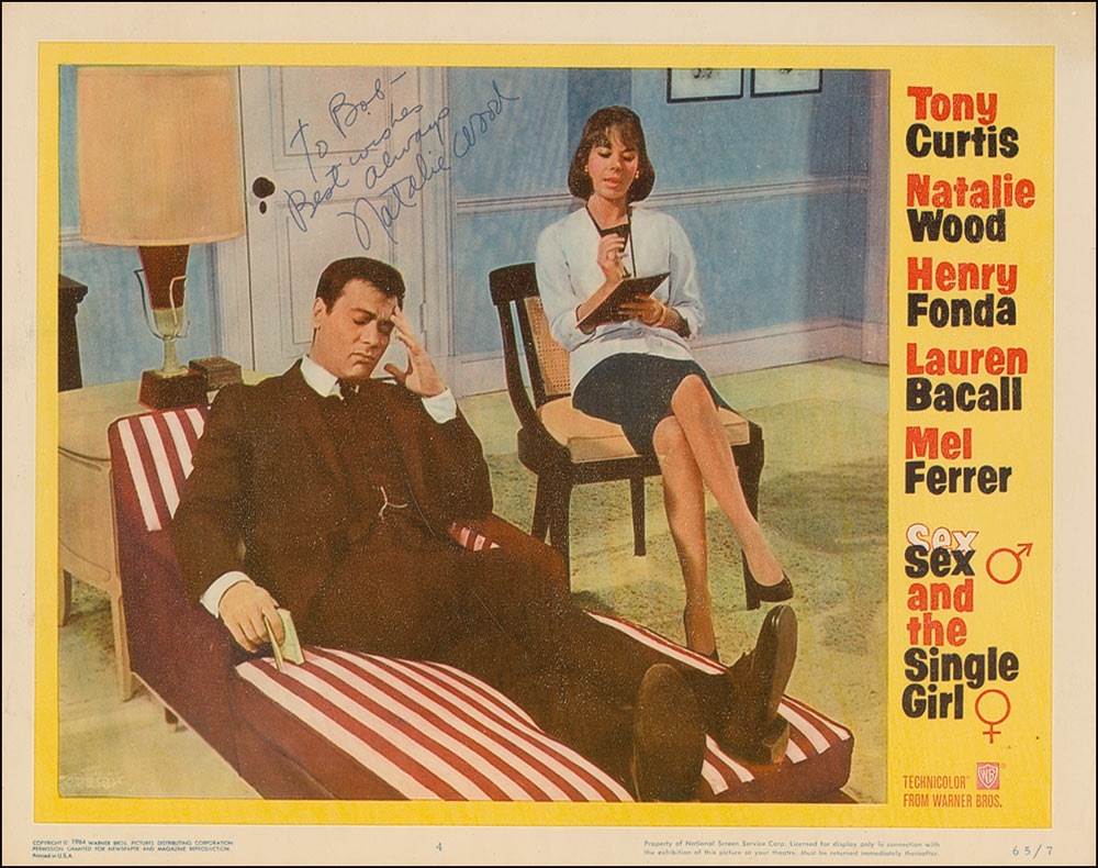 Color 14 x 11 lobby card for Sex and the Single Girl, signed and inscribed in blue ink, “To Bob—Best wishes always, Natalie Wood.” In fine condition, with some mild border toning and a few light bends and creases. Pre-certified PSA/DNA and RR Auction COA.