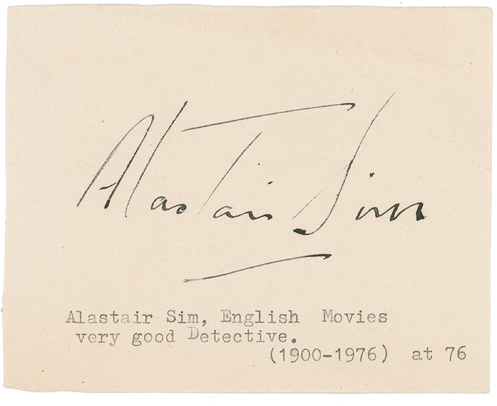 Scottish character actor (1900–1976), best remembered for the role of Ebenezer Scrooge in the 1951 film Scrooge, and for his portrayal of Miss Fritton, the headmistress in two St. Trinian's films. Vintage fountain pen signature, “Alastair Sim,” on an off-white 4.25 x 3.5 slip. In fine condition, with light toning, trimmed edges, and a typed collector’s notation along the bottom of the card. Pre-certified PSA/DNA and RR Auction COA.