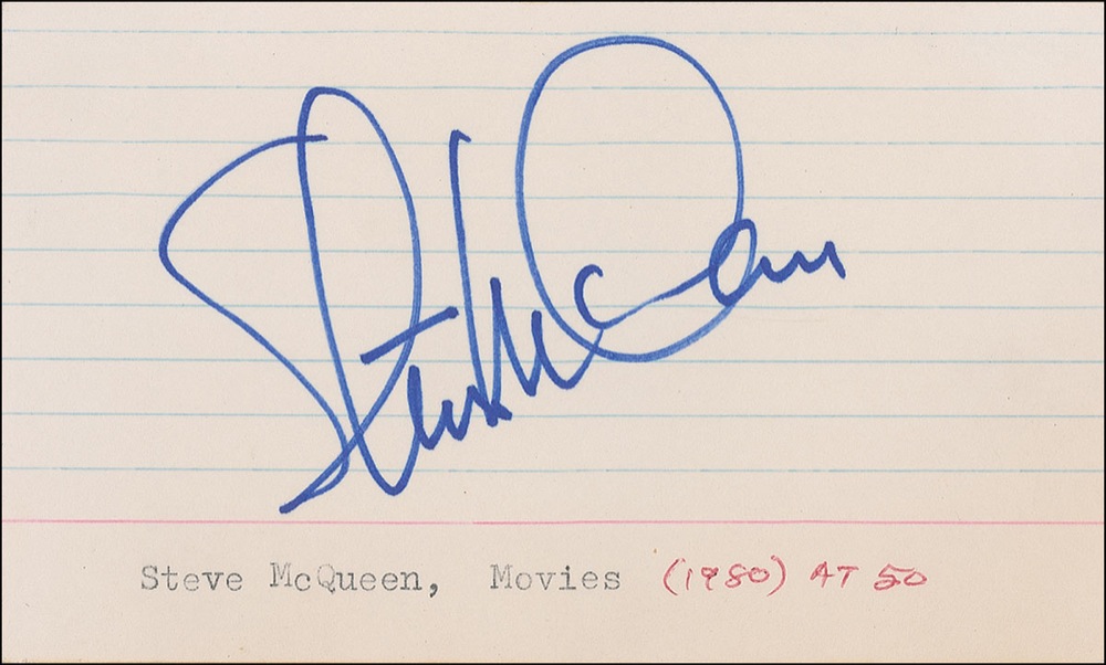 Fantastically bold felt tip signature, “Steve McQueen,” on an off-white 5 x 3 lightly-lined card. In fine condition, with light toning to the bottom edge and an ink and typed collector’s notation along the bottom as well. Pre-certified PSA/DNA and RR Auction COA.