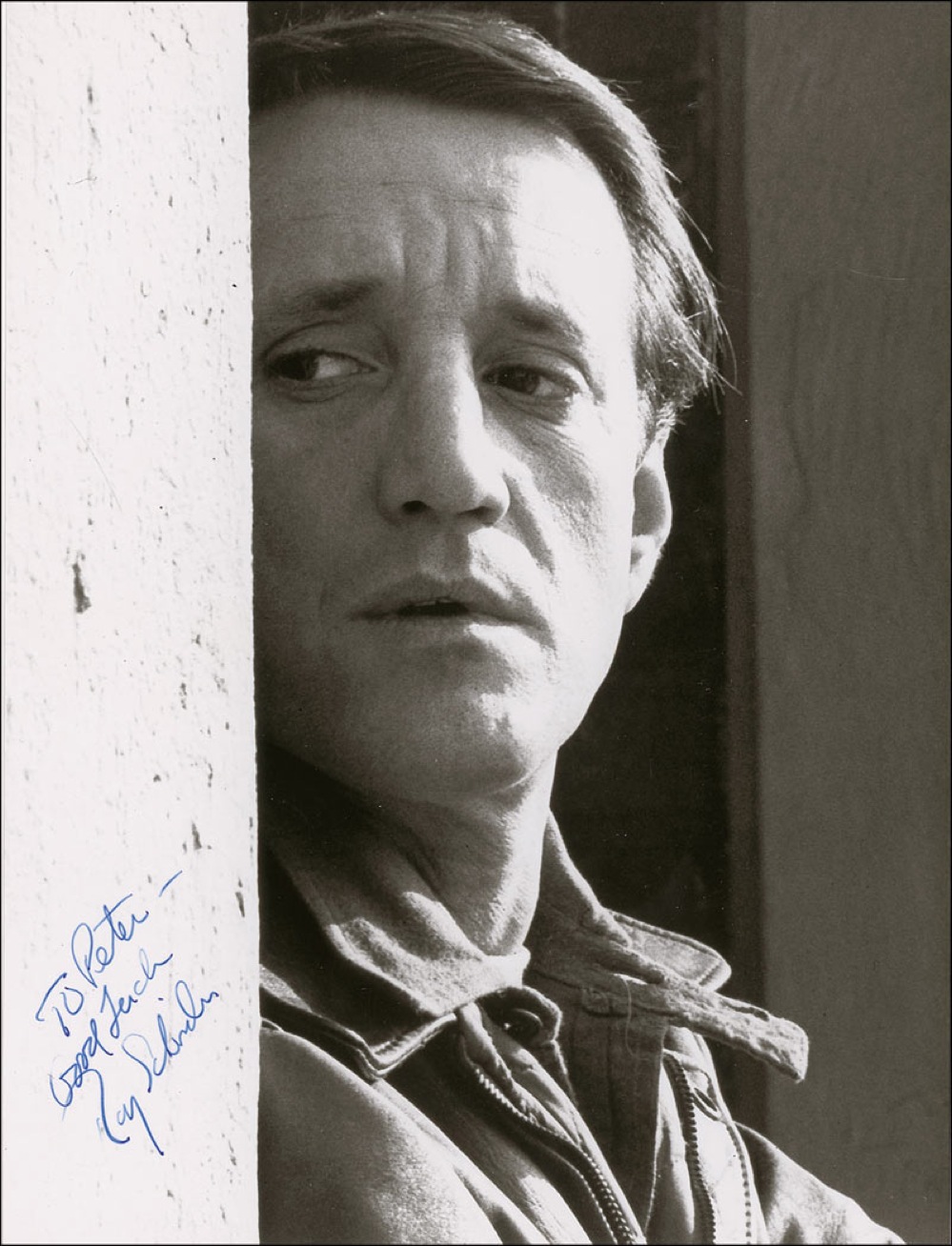 Vintage glossy 7 x 9.25 photo of Scheider from The French Connection, signed and inscribed in blue ink “To Peter—Good luck, Roy Scheider.” In fine condition, with trimmed edges and a few light surface impressions. Pre-certified PSA/DNA and RR Auction COA.