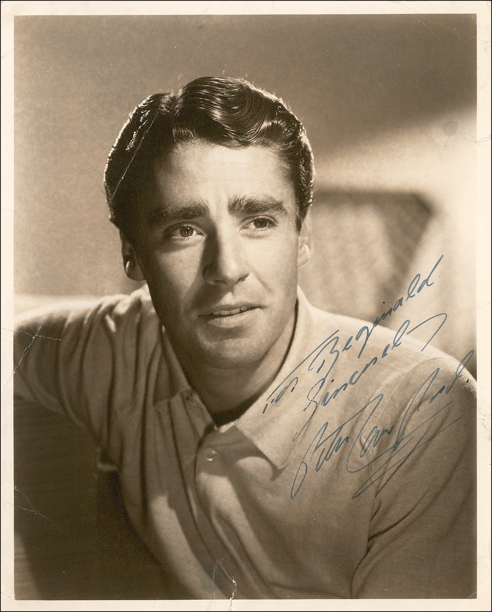 Vintage matte-finish 8 x 10 head-and-shoulders photo, signed and inscribed in fountain pen “For Reginald, Sincerely, Peter Lawford.” In good condition, with several noticeable creases, a few edge tears, and some light discoloration to background. Pre-certified PSA/DNA and RR Auction COA.